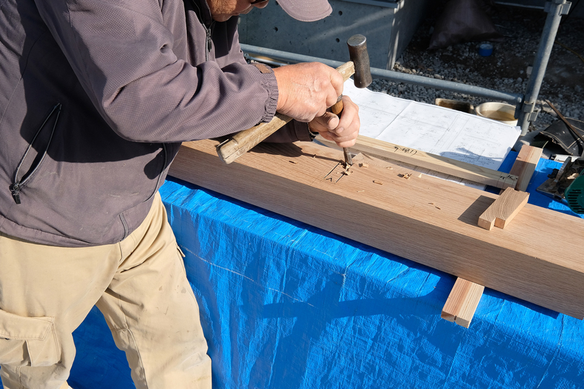 大工さんが玄関建具の鴨居を製作中。
