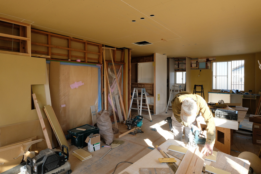 LDK、少し奥まった位置にあったキッチンを見通しのいい対面キッチンにしたい、というのが当初のご要望でした。