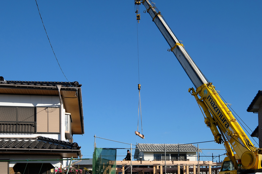この日曜日は棟上げでした。 皆でお昼を頂き、満潮に向かう時間帯に、建主が大工さんと一緒に棟を沈めます …