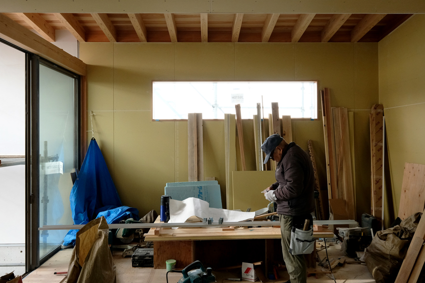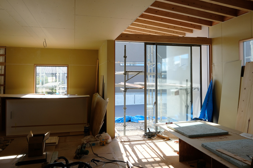どんどん進んでいます。 LDK、少し奥まった位置にあったキッチンを見通し …